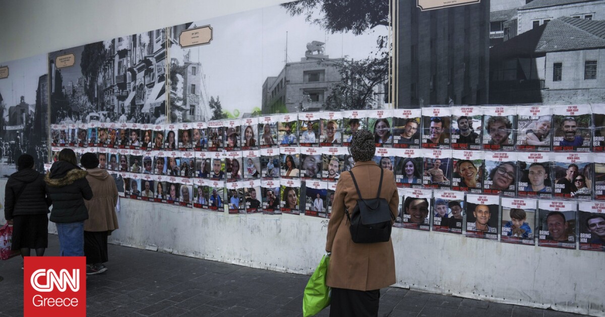 Τοίχος με αναρτημένα τα πρόσωπα των ομήρων που κρατούνται από τη Χαμάς AP Photo/Mahmoud Illean