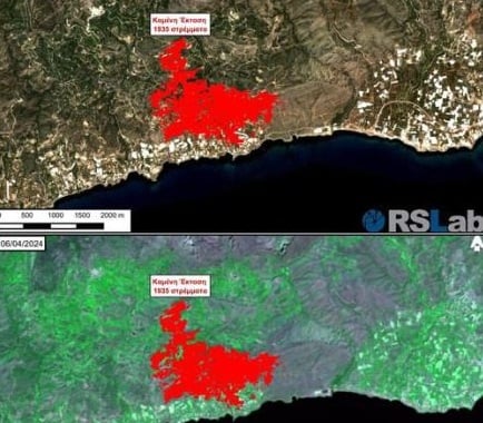 Δύο χιλιάδες στρέμματα έχουν γίνει στάχτη στο Μαύρο Κόλυμπο στην Iεράπετρα, όπως καταγράφονται απ’ το Εργαστήριο Τηλεπισκόπησης (https://rslab.gr/) του ΙΤΕ (Ίδρυμα Τεχνολογίας και Έρευνας), μέχρι τις πρώτες μεσημεριανές ώρες του Σαββάτου, 06/04/2024, με τη χρήση δορυφορικών δεδομένων Sentinel-2.