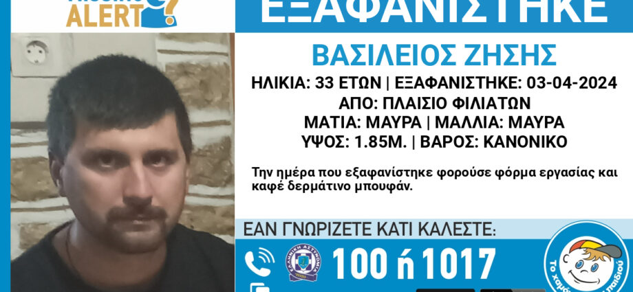 Συναγερμός σήμανε στις Αρχές από την εξαφάνιση ενός 33χρονου από το χωριό Πλαίσιο Φιλιατών στην Θεσπρωτία.