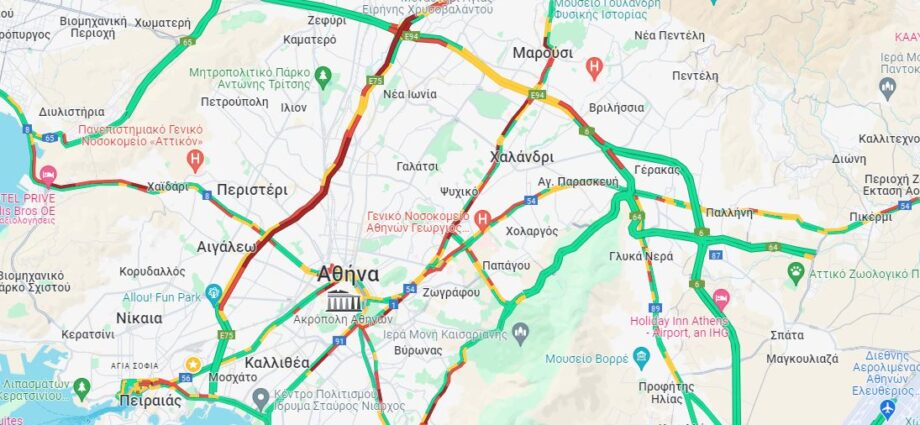 Στο… κόκκινο βρίσκεται η κάθοδος του Κηφισού, ενώ μετ’ εμποδίων διεξάγεται η κυκλοφορία σε Μεσογείων και Κατεχάκη (στο ρεύμα από Ηλιούπολη).