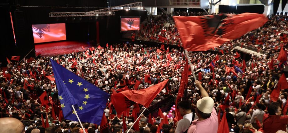Πλήθος κόσμου έχει συγκεντρωθεί στο στάδιο του Γαλατσίου το πρωί της Κυριακής για να παρακολουθήσει την ομιλία του πρωθυπουργού της Αλβανίας Έντι Ράμα.