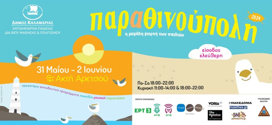 Παραθινούπολη 2024, παιδικό φεστιβάλ Δήμου Καλαμαριάς Η μεγάλη γιορτή των παιδιών, 31 Μαΐου ως 2 Ιουνίου, Ακτή Αρετσού παιχνίδια, εργαστήρια, καλλιτεχνικές παραστάσεις