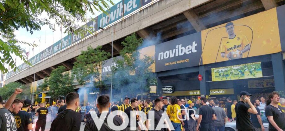 Με κιτρινόμαυρα κασκόλ και φανέλες στα χρώματα της αγαπημένης τους ομάδας, οι οπαδοί του Άρη έχουν κατακλύσει περιμετρικά το Κλεάνθης Βικελίδης, στη Χαριλάου, λίγες ώρες πριν τον τελικό Κυπέλλου στο Πανθεσσαλικό Στάδιο.