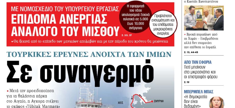 Διαβάστε στα «ΝΕΑ» της Δευτέρας:Τουρκικές έρευνες ανοιχτά των Ιμίων Σε συναγερμό • Μετά την προειδοποίηση για τα θαλάσσια πάρκα στο Αιγαίο, η Αγκυρα στέλνει το σκάφος «Tübitak Marmara» έξω από τη Σμύρνη σε ειδική αποστολή • Εξέδωσε NAVTEX με ισχύ έως 15 Ιουνίου • Προς το παρόν κινείται εντός τουρκικών χωρικών υδάτων 5,4 ναυτικά μίλια από τα Ιμια ================Με νομοσχέδιο του υπουργείου Εργασίας Επίδομα ανεργίας ανάλογο του μισθού • Θα ξεκινά από το επίπεδο των μηνιαίων απολαβών και με την πάροδο του χρόνου θα μειώνεταιH εφαρμογή του νέου υπολογισμού ξεκινά πιλοτικά σε 5.000 έως 10.000 ανέργους Προβλέπεται ενσωμάτωση και του… Πηγή