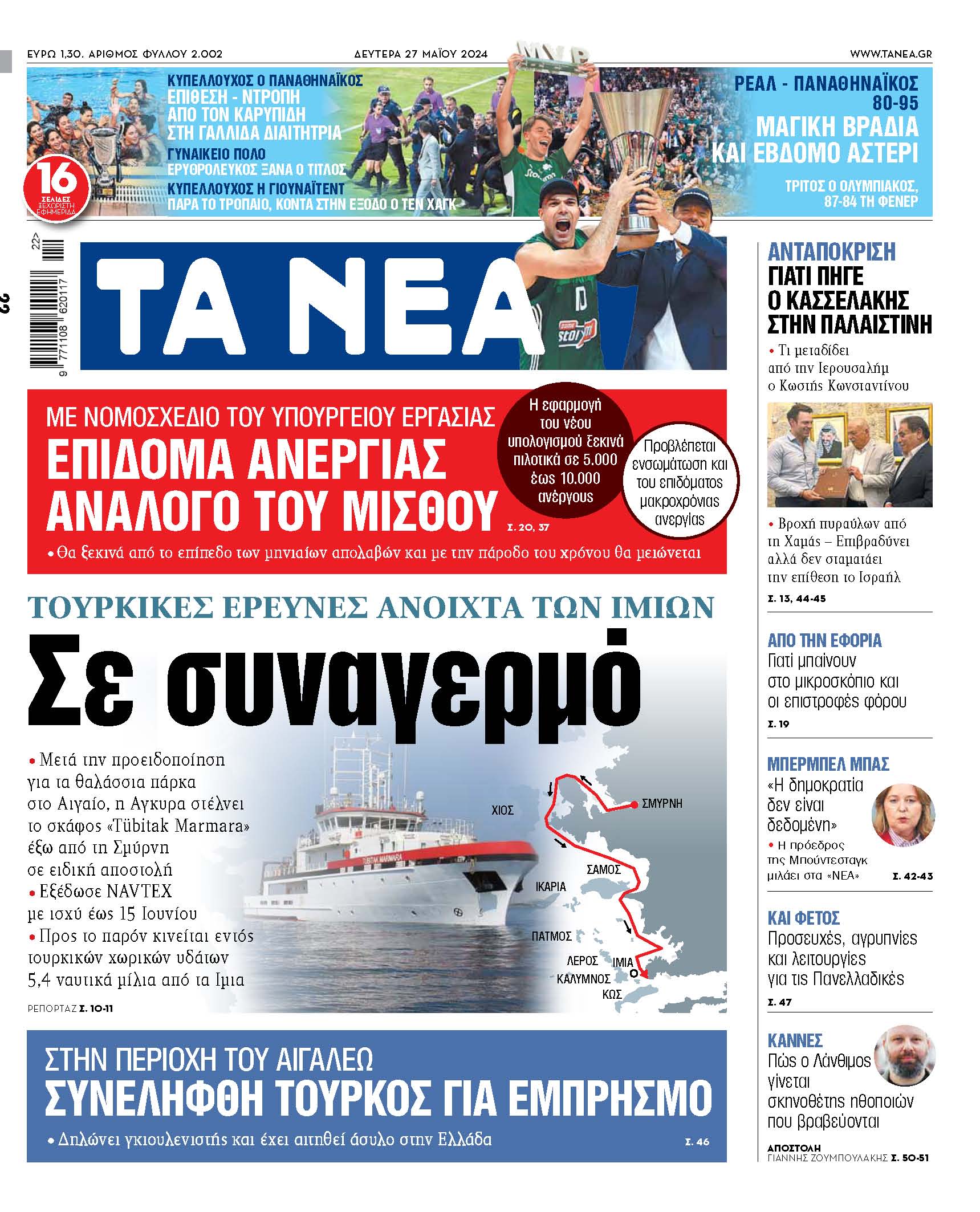 Διαβάστε στα «ΝΕΑ» της Δευτέρας:Τουρκικές έρευνες ανοιχτά των Ιμίων Σε συναγερμό • Μετά την προειδοποίηση για τα θαλάσσια πάρκα στο Αιγαίο, η Αγκυρα στέλνει το σκάφος «Tübitak Marmara» έξω από τη Σμύρνη σε ειδική αποστολή • Εξέδωσε NAVTEX με ισχύ έως 15 Ιουνίου • Προς το παρόν κινείται εντός τουρκικών χωρικών υδάτων 5,4 ναυτικά μίλια από τα Ιμια ================Με νομοσχέδιο του υπουργείου Εργασίας Επίδομα ανεργίας ανάλογο του μισθού • Θα ξεκινά από το επίπεδο των μηνιαίων απολαβών και με την πάροδο του χρόνου θα μειώνεταιH εφαρμογή του νέου υπολογισμού ξεκινά πιλοτικά σε 5.000 έως 10.000 ανέργους Προβλέπεται ενσωμάτωση και του… Πηγή