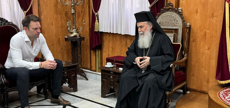 Το Πατριαρχείο Ιεροσολύμων επισκέφθηκε ο Πρόεδρος του ΣΥΡΙΖΑ – ΠΣ, κος Στέφανος Κασσελάκης, ο οποίος πραγματοποίησε συνάντηση με την ΑΘΜ, Πατριάρχη τῆς Ἁγίας Πόλεως Ἱερουσαλήμ καὶ πάσης Παλαιστίνης κ.κ. Θεόφιλο τον Γ’.