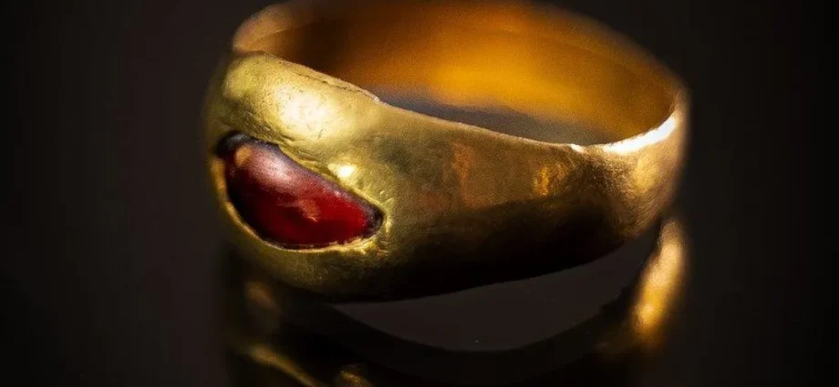 Ένα εκπληκτικό δείγμα αρχαίων κοσμημάτων, ένα μικρό χρυσό δαχτυλίδι, διακοσμημένο με πολύτιμο κόκκινο λίθο, ο οποίος πιστεύεται ότι είναι γρανάτης, έφερε στο φως η αρχαιολογική σκαπάνη και η ηλικία του εκτιμάται ότι είναι 2.300 ετών.