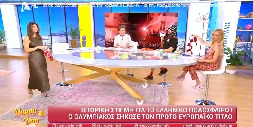 Η Σταματίνα Τσιμτσιλή και ο Κώστας Φραγκολιάς έκαναν πανηγυρική έναρξη στο Happy Day. Η παρουσιάστρια του Alpha έδωσε τα συγχαρητήριά της στον Ολυμπιακό για την ιστορική του νίκη επί της Φιορεντίνα, ενώ ο Κώστας Φραγκολιάς είπε ένα από τα συνθήματα των Ερυθρόλευκων χρησιμοποιώντας έναν… τηλεβόα.