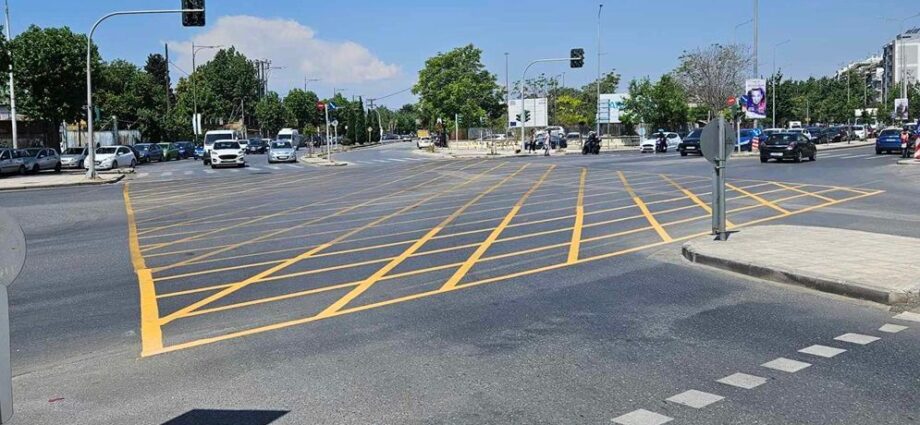 Εργασίες διαγράμμισης κίτρινου χρώματος πλεγμάτων σε ισόπεδους κόμβους (yellow box) που έχουν ιδιαίτερα επιβαρυμένο κυκλοφοριακό φόρτο πραγματοποιεί από σήμερα η διεύθυνση Βιώσιμης Κινητικότητας του δήμου Θεσσαλονίκης σε συνεργασία με τη Διεύθυνση Τροχαίας Θεσσαλονίκης, στο πλαίσιο του έργου «ΠΑΡΕΜΒΑΣΕΙΣ ΒΕΛΤΙΩΣΗΣ ΤΗΣ ΟΔΙΚΗΣ ΑΣΦΑΛΕΙΑΣ ΣΕ ΟΛΕΣ ΤΙΣ ΔΗΜΟΤΙΚΕΣ ΚΟΙΝΟΤΗΤΕΣ ΤΟΥ ΔΗΜΟΥ ΘΕΣΣΑΛΟΝΙΚΗΣ».