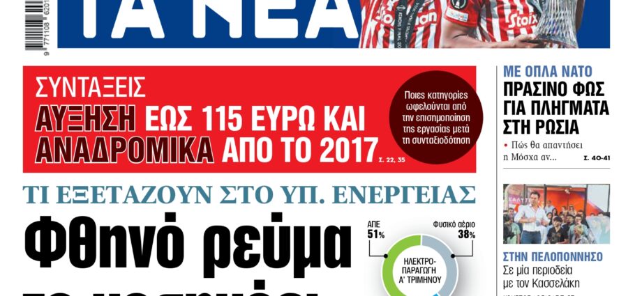 Στα «ΝΕΑ» της Παρασκευής:ΤΙ ΕΞΕΤΑΖΟΥΝ ΣΤΟ ΥΠ. ΕΝΕΡΓΕΙΑΣ Φθηνό ρεύμα το μεσημέρι…•Θα προηγηθεί η μετακίνηση ή κατάργηση του νυχτερινού τιμολογίου•Προτιμώνται οι ώρες που γίνεται μεγαλύτερη κατανάλωση αλλά και μεγαλύτερη παραγωγή ενέργειας μέσω ΑΠΕ•Τι αλλαγές έρχονται από το φθινόπωρο με τη χρήση των έξυπνων μετρητών==================ΣΥΝΤΑΞΕΙΣ Αύξηση έως 115 ευρώ και αναδρομικά από το 2017Ποιες κατηγορίες ωφελούνται από την επισημοποίηση της εργασίας μετά τη συνταξιοδότηση==================ΓΙΑ ΤΗΝ ΥΠΟΘΕΣΗ ΣΤΟΡΜΙ ΝΤΑΝΙΕΛΣ Ενοχος ο Τραμπ • Και πρόταση στον Ιλον Μασκ να αναλάβει σύμβουλός του αν εκλεγεί πρόεδρος==================ΜΕ ΟΠΛΑ ΝΑΤΟΠράσινο φως για πλήγματα στη Ρωσία• Πώς θα απαντήσει η Μόσχα αν…==================ΣΤΗΝ ΠΕΛΟΠΟΝΝΗΣΟΣε μία περιοδεία με τον… Πηγή