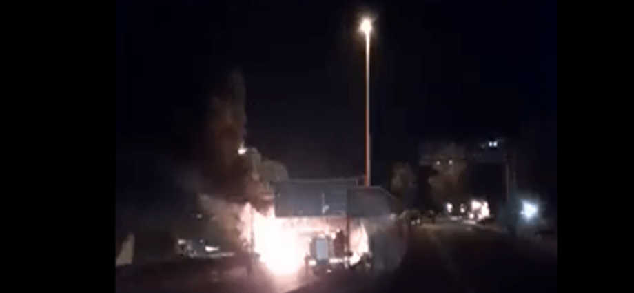 Βίντεο περαστικών καταγράφει το πύρινο μέτωπο που δημιουργήθηκε μετά την ανατροπή του βυτιοφόρου στο 77ο χιλιόμετρο, με αποτέλεσμα να καταρρεύσει η μεταλλική γέφυρα στην παλαιά εθνική οδό, κοντά στον Ισθμό, καθώς ο οδηγός περνούσε από εκεί.
