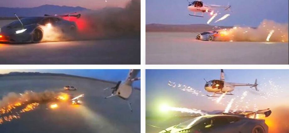 Το βίντεο δείχνει δύο γυναίκες να εκτοξεύουν πυροτεχνήματα σε μια Lamborghini Huracan από ένα ελικόπτερο σε πτήση.