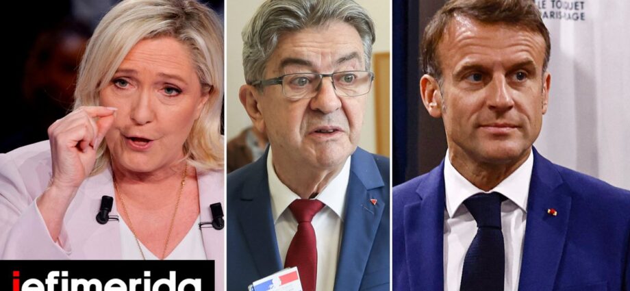 Εθνική Συσπείρωση (Λεπέν): 34% και 260-310 έδρες Νέο Λαϊκό Μέτωπο (Μελανσόν): 28,1% και 115-165 έδρες Αναγέννηση (Μακρόν): 20,3% και 90-120 έδρες Ρεπουμπλικανοί: 10,2% και 30-50 έδρες