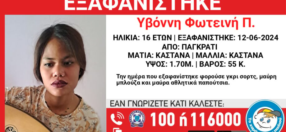 Τα ίχνη της Υβόννης Φωτεινής Π. χάθηκαν στις 12/06/2024 από το Παγκράτι. Το «Χαμόγελο του Παιδιού» ενημερώθηκε για την εξαφάνιση και προέβη στην ενεργοποίηση του μηχανισμού Missing Kid Alert, κατόπιν αιτήματος της οικογένειας της, καθώς ενδέχεται να συντρέχουν σοβαροί λόγοι που θέτουν τη ζωή της σε κίνδυνο.