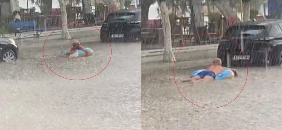 Ωστόσο, ένας άνδρας δεν πτοήθηκε. Φόρεσε το μαγιό του, πήρε την κουλούρα του και βγήκε στον πλημμυρισμένο δρόμο για να κολυμπήσει, ενώ τα αυτοκίνητα τού κόρναραν.