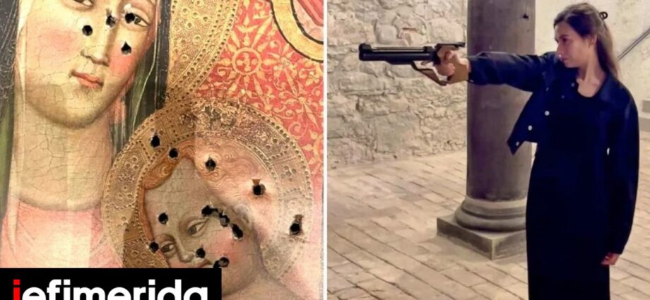 Η 32χρονη πυροβόλησε με αθλητικό πιστόλι σε μια αφίσα δημοπρασίας ενός πίνακα ζωγραφικής της Παναγίας και του Χριστού του 14ου αιώνα και δημοσίευσε στα μέσα κοινωνικής δικτύωσης εικόνες με τις σφαίρες στα πρόσωπά τους.