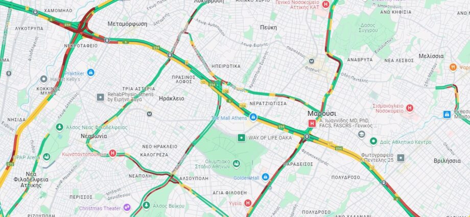 Στο «κόκκινο» βρίσκεται η έξοδος της Εθνικής Οδού Αθηνών – Κορίνθου και η έξοδος της Αθηνών- Λαμίας, ενώ ολοένα και δυσκολεύει η εικόνα στον Κηφισό.