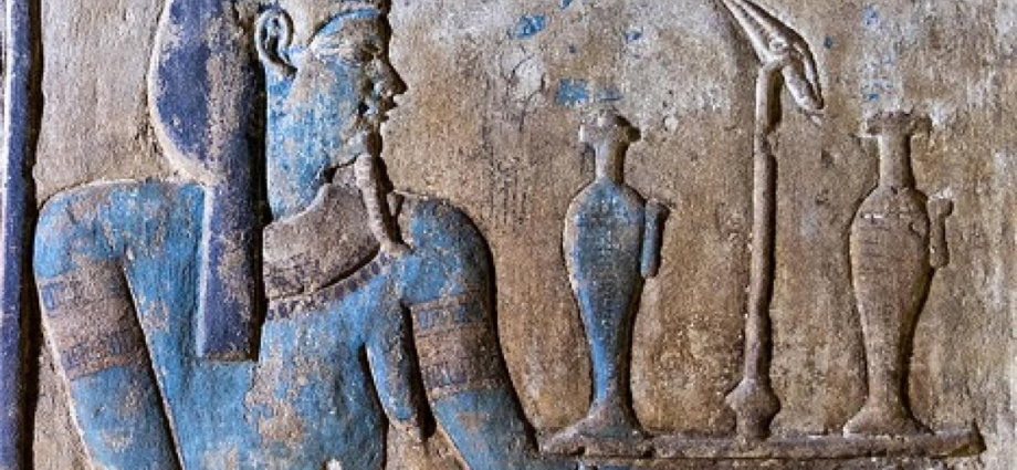 Παράδειγμα ζωγραφικής μετά την αποκατάσταση. Απεικονίζεται ο θεός Νείλος με ζωγραφιστές λεπτομέρειες (κοσμήματα, κόρη του ματιού) και λουλούδια στον δίσκο των προσφορών. Martin Stadler / Universität Würzburg