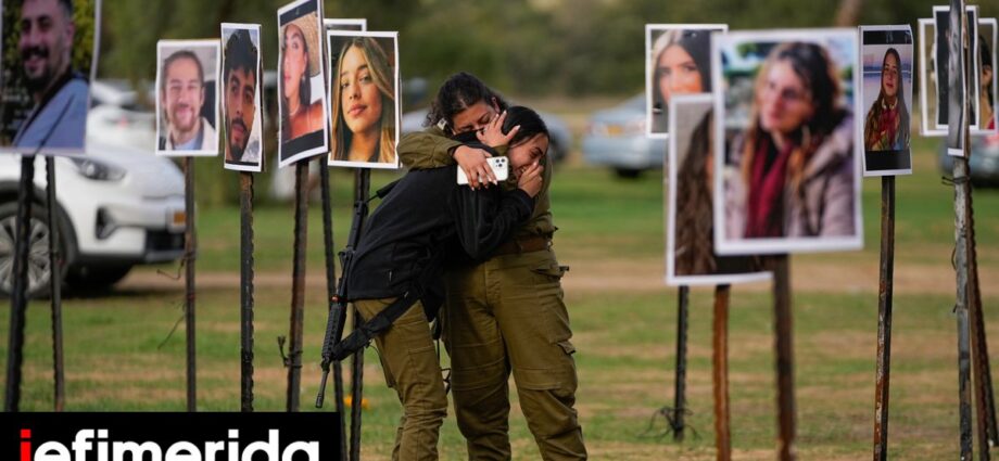 Ισραηλινοί στρατιώτες κλαίνε δίπλα σε φωτογραφίες ανθρώπων που σκοτώθηκαν και αιχμαλωτίστηκαν από τρομοκράτες της Χαμάς στο μουσικό φεστιβάλ Nova / Φωτογραφία: AP