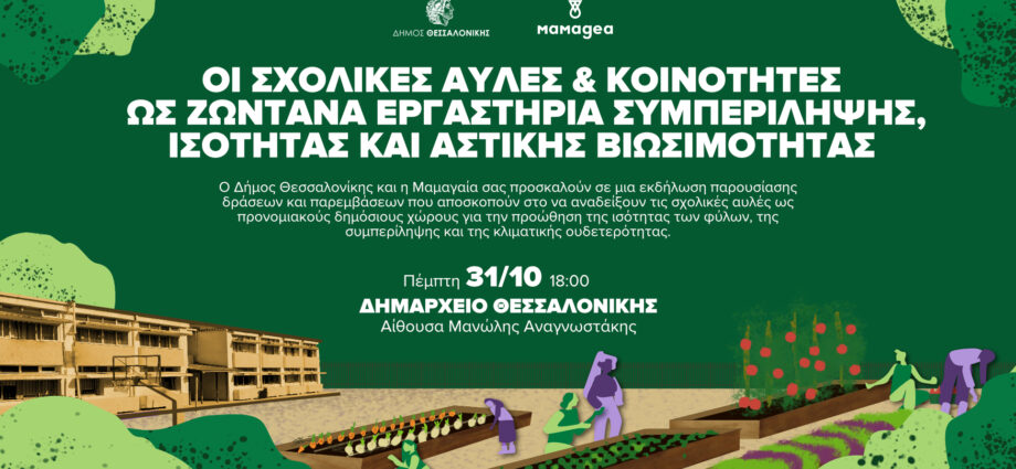 Εκδήλωση παρουσίασης δράσεων που στοχεύουν στην ανάδειξη των σχολικών αυλών ως προνομιακών δημόσιων χώρων για την προώθηση της ισότητας, της συμπερίληψης και της κλιματικής ουδετερότητας συνδιοργανώνουν την Πέμπτη 31 Οκτωβρίου ο δήμος Θεσσαλονίκης και η Μαμαγαία.
