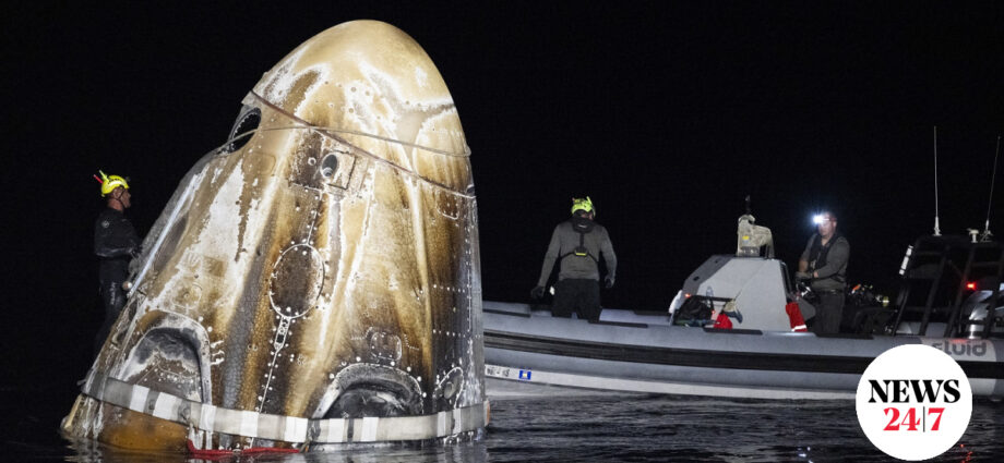 Η κάψουλα της SpaceX που μετέφερε το πλήρωμα έπεσε με αλεξίπτωτο πριν από τα ξημερώματα στον Κόλπο του Μεξικού, στα ανοικτά των ακτών της Φλόριντα, αφού αποσυνδέθηκε από τον Διεθνή Διαστημικό Σταθμό στα μέσα της εβδομάδας.