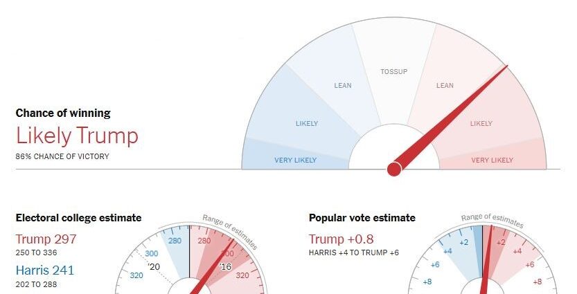 Η Βελόνα εξετάζει δύο θεμελιώδη ερωτήματα: Πού βρίσκονται οι ψήφοι που απομένουν να καταμετρηθούν σε μια συγκεκριμένη κούρσα και ποιος υποψήφιος τα πηγαίνει καλύτερα από ό,τι αναμενόταν στα μέχρι τώρα αποτελέσματα. Η Βελόνα υπολογίζει πως ο Ντόναλντ Τραμπ έχει 95% πιθανότητες να εκλεγεί με (μεσοσταθμικά) 297 έδρες από τις 270 που χρειάζεται.