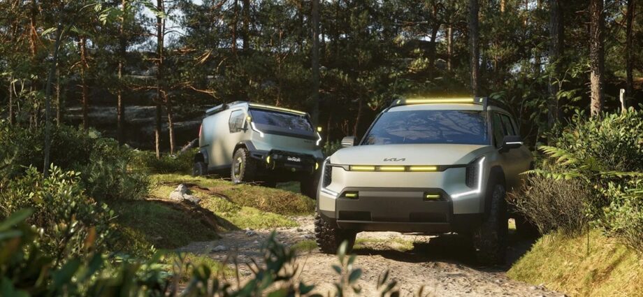Εν αρχή το EV9 Advntr, ένα φιλόδοξο project για ένα ηλεκτρικό crossover τριών σειρών, εστιασμένο στις εκτός δρόμου περιπέτειες. Είναι κατά 76 χιλιοστά πιο χηλό από το εργοστασιακό μοντέλο και διαθέτει στιβαρή μπροστινή όψη με εμφανή άγκιστρα ανάκτησης.