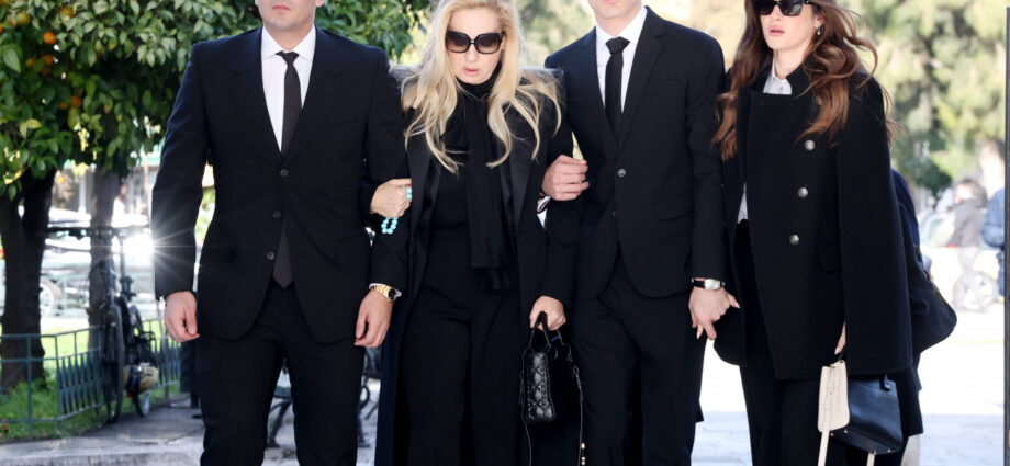 Υποβασταζόμενη από τα τρία παιδιά της Άρη, Αλέξανδρο και Φιλίππα, η σύζυγος του Αντώνη Λυμπέρη, Έλενα Μακρή. Το τελευταίο αντίο στον εκδότη λένε συγγενείς, φίλοι και συνεργάτες.