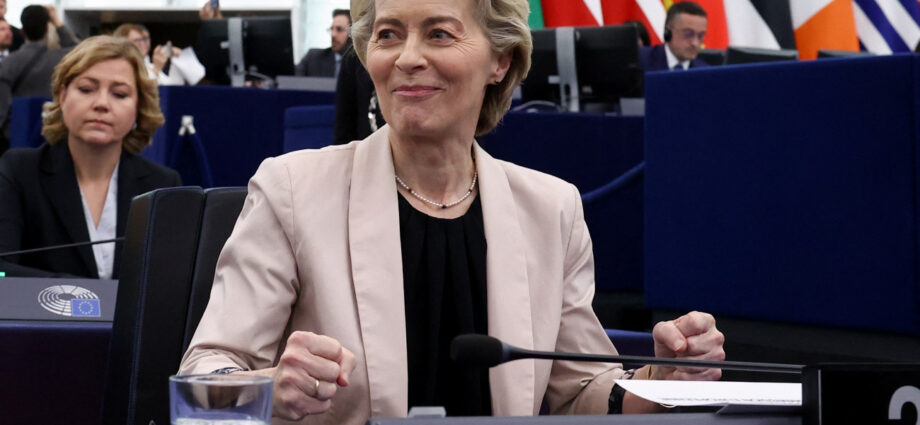 Αυτό σηματοδοτεί τη δεύτερη θητεία της φον ντερ Λάιεν ως επικεφαλής της Επιτροπής, μετά την έγκριση της πρώτης της Επιτροπής από τους ευρωβουλευτές τον Νοέμβριο του 2019.