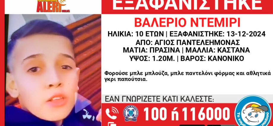 Συναγερμός έχει σημάνει στις αρμόδιες αρχές για την εξαφάνιση ενός 10χρονου αγοριού από την περιοχή του Αγίου Παντελεήμονα.