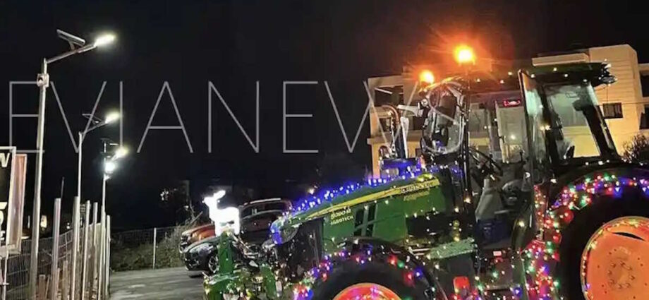 Τα Χριστούγεννα ήρθαν στο Αλιβέρι της Εύβοιας για τον Δημήτρη Πάντζαλη που διατηρεί μάντρα αυτοκινήτων στην περιοχή και παρότρυνε τον φίλο του Κώστα Μπόκαρη να στολίσει το τρακτέρ του με πολύχρωμα λαμπιόνια.
