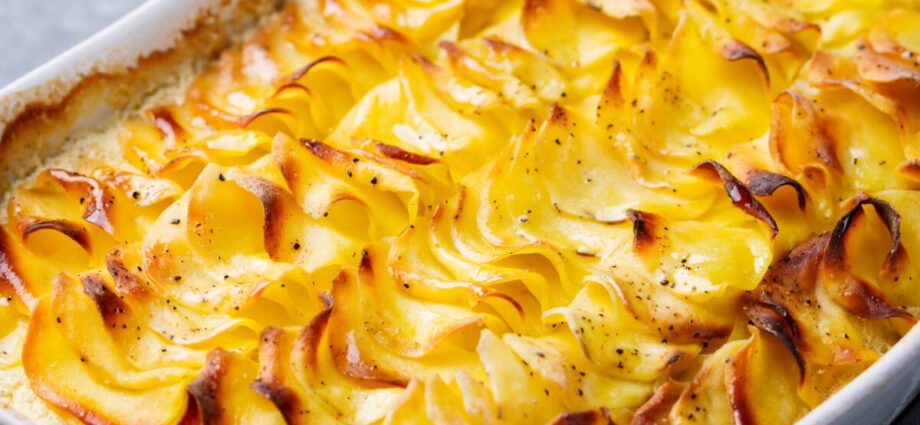 Οι πατάτες βράζουν σε ένα μείγμα γάλακτος και κρέμας και ύστερα μπαίνουν για λίγα λεπτά σε δυνατό φούρνο, μέχρι να κάνει όμορφη, χρυσαφένια κρούστα η επιφάνεια.