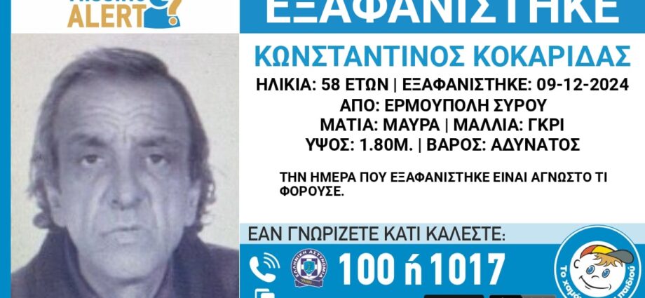 Συναγερμός έχει σημάνει στις Αρχές για την εξαφάνιση του 58χρονου Κωνσταντίνου Κοκαρίδα, από την Ερμούπολη της Σύρου.