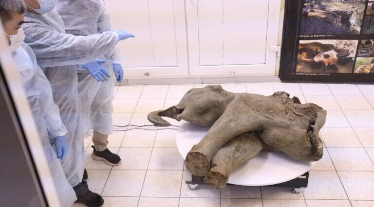 This handout picture taken and released by the North-Eastern Federal University on December 23, 2024, shows the carcass of a baby mammoth, which is estimated to be over 50,000 years old, during its presentation in Yakutsk. Russian scientists on December 23, 2024 showed off the remarkably well preserved remains of a baby mammoth found in the permafrost-covered region of Yakutia. The 50,000-year-old female mammoth has been nicknamed “Yana” after the river in whose basin it was discovered this summer. The remains weigh 180 kilograms (397 pounds) and are 120 centimetres (four feet) tall and 200 centimetres long. The carcass was… Πηγή