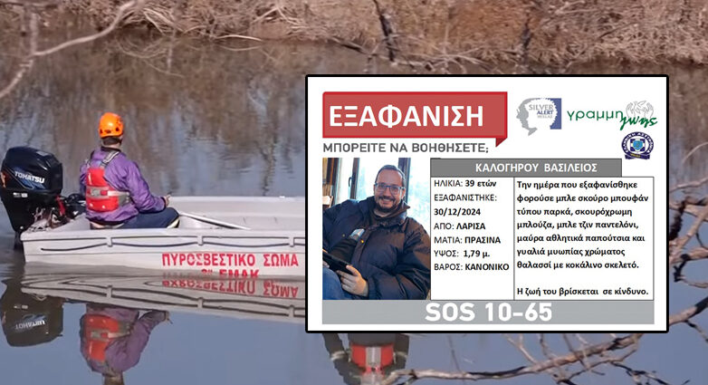 Συνεχίζονται οι έρευνες και σήμερα για τον 39χρονο Βασίλειο Καλογήρου, του οποίου τα ίχνη έχουν χαθεί από το απόγευμα της Δευτέρας 30 Δεκεμβρίου 2ο24 στη Λάρισα.