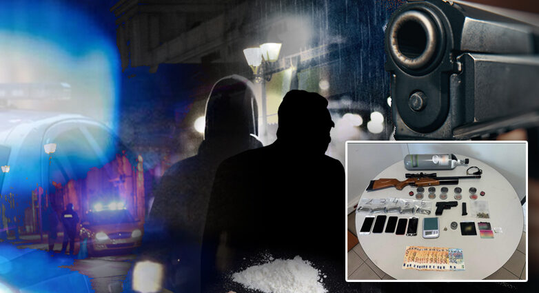 Μεταξύ άλλων βρέθηκαν και κατασχέθηκαν ένα (1) πιστόλι με φυσίγγια των 9mm, πέντε (5) κενοί γεμιστήρες, ένα (1) αεροβόλο τυφέκιο με διόπτρα και δύο (2) γεμιστήρες αεροβόλου.
