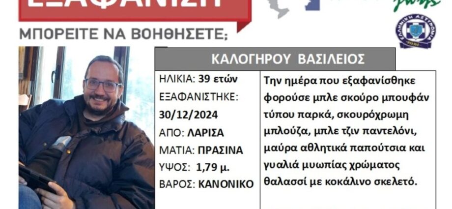 Σημειώνεται πως ο Βασίλης Καλογήρου, ψυχολόγος σε σχολείο της Καστοριάς, εξαφανίστηκε στις 30 Δεκεμβρίου από τη Λάρισα όταν βγήκε για μια βόλτα στην περιοχή του Πηνειού. Έφυγε χωρίς να πάρει μαζί του το κινητό τηλέφωνό του ή το αυτοκίνητό του. Σύμφωνα με την οικογένειά του δεν αντιμετωπίζει προβλήματα σωματικά ή ψυχολογικά.