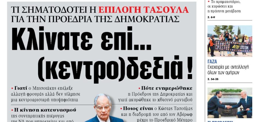 Διαβάστε στα «ΝΕΑ» της Πέμπτης:Τι σηματοδοτεί η επιλογή Τασούλα για την Προεδρία της Δημοκρατίας Κλίνατε επί… (κεντρο)δεξιά! • Γιατί ο Μητσοτάκης επέλεξε αλλαγή φρουράς αλλά δεν τόλμησε μια κεντροαριστερή υποψηφιότητα • Η κίνηση κατευνασμού της συντηρητικής πτέρυγας της ΝΔ που υπηρετείται και από την επιλογή Νικήτα Κακλαμάνη για την Προεδρία της Βουλής • Η συνάντηση του Σαββάτου του Πρωθυπουργού με τον Πρόεδρο της Βουλής και τι συμφωνήθηκε • Πότε ενημερώθηκε η Πρόεδρος της Δημοκρατίας και γιατί ακυρώθηκε το χθεσινό ραντεβού • Ποιος είναι ο Κώστας Τασούλας και η διαδρομή του από τον Αβέρωφ μέχρι το Προεδρικό Μέγαρο • Πώς αντιδρούν… Πηγή