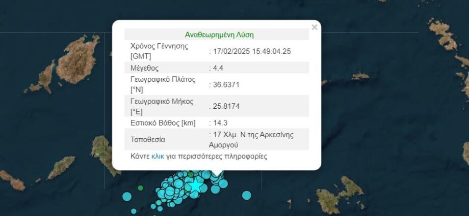 Σεισμός 4,4 Ρίχτερ ανοιχτά της Αμοργού 17:59, Δευτέρα 17 Φεβρουαρίου 2025 κοινωνία Νέος σεισμός 4,4 Ρίχτερ σημειώθηκε πριν από λίγο ανοιχτά της Αμοργού.