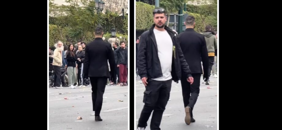 UPD! Ύποπτη παρουσία: Ο «Εκτελεστής» με το κοστούμι, τα μαύρα γάντια και την χειροβομβίδα κρότου – λάμψης στο χέρι στην συγκέντρωση των Τεμπών