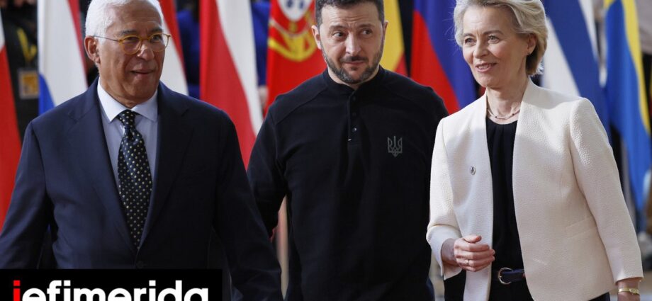 Ο Ουκρανός πρόεδρος Bολοντίμιρ Ζελένσκι με την πρόεδρο της Κομισιόν, Ούρσουλα φον ντερ Λάιεν, και τον πρόεδρο του Ευρωπαϊκού Συμβουλίου, Αντόνιο Κόστα / Φωτογραφία: AP