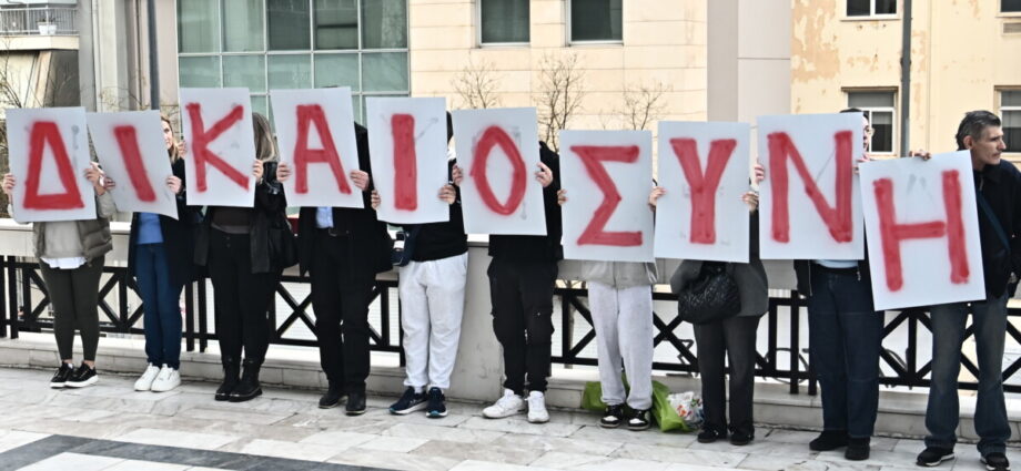 Με ένα μεγάλο πανό που από τη μία πλευρά γράφει “Δικαιοσύνη” και από την άλλη “Κακούργημα” οι συγγενείς των θυμάτων, γονείς, παιδιά αλλά και αλληλέγγυα άτομα, ζητούν την καταδίκη των κατηγορουμένων, αλληλέγγυα άτομα με σύνθημα “Μάνδρα – Μάτι – Τέμπη : δικά τους τα κέρδη, δικοί μας οι νεκροί”.