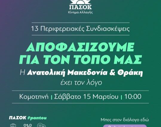 Με στόχο τη χάραξη μίας αναπτυξιακής πολιτικής ειδικά για τις ανάγκες και τα προβλήματα της Περιφέρειας Ανατολικής Μακεδονίας και Θράκης θα πραγματοποιηθεί αύριο Σάββατο στην Κομοτηνή η Περιφερειακή Συνδιάσκεψη του ΠΑΣΟΚ-ΚΙΝΑΛ, στο ξενοδοχείο Chris & Eve, παρουσία και του προέδρου του κόμματος, Νίκου Ανδρουλάκη.