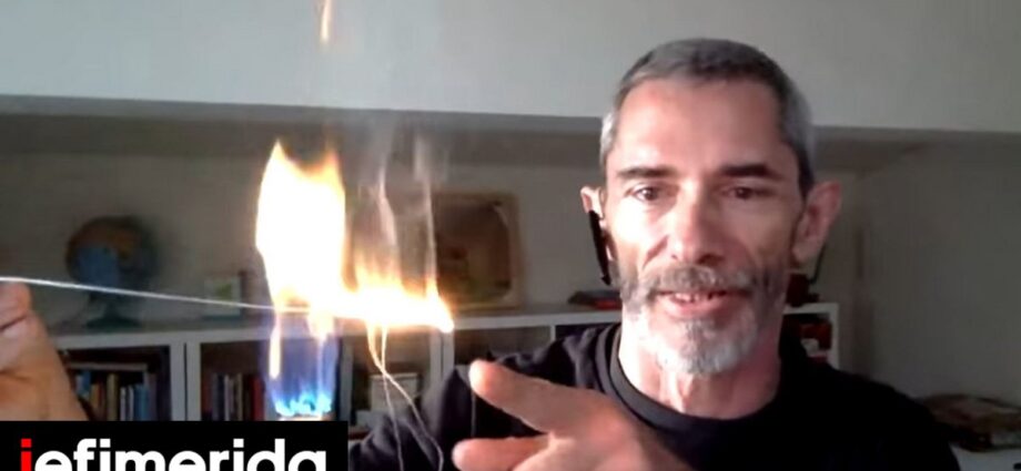 «Πολύ κόσμος ψάχνει πράγματα στο Internet και νομίζει ότι κάτι έγινε. Εδώ είναι ένας λύχνος Μπούνσεν, με τη θερμοκρασία στο κέντρο της φλόγας να είναι περίπου 1.200 βαθμοί Κελσίου. Φτάνει μέχρι και 1.500, αν το ρυθμίσουμε τέλεια. Το χέρι καίγεται στους 65-70 βαθμούς Κελσίου. Αν το δέρμα πάει πάνω από 70 βαθμούς, θα πάθω εγκαύματα. Εδώ έχω 1.500 βαθμούς Κελσίου. Γιατί δεν καίγομαι; Περνάει το χέρι μου μέσα από θερμοκρασία 1.200 βαθμών…