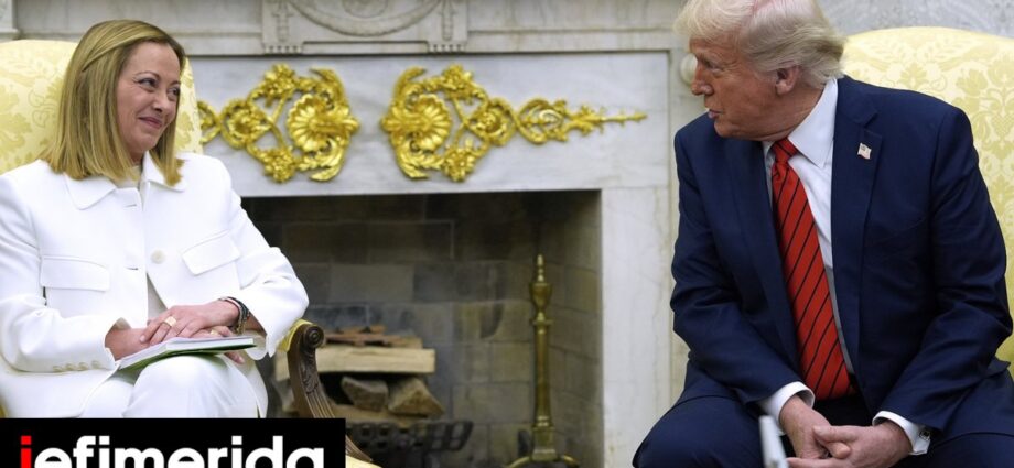 Ο Ντόναλντ Τραμπ και η Τζόρτζια Μελόνι μίλησαν στο Οβάλ Γραφείο, περιτριγυρισμένοι από αξιωματούχους και δημοσιογράφους
