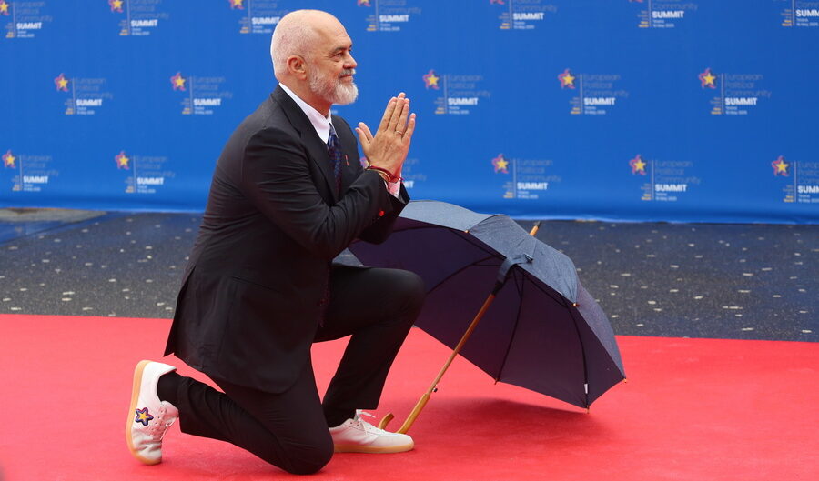 Ο πρωθυπουργός της Αλβανίας Έντι Ράμα υποδέχθηκε γονατιστός την Τζόρτζια Μελόνι στη Σύνοδο Κορυφής στα Τίρανα την Παρασκευή (16/5). Ads Η Μελόνι περπατούσε στο κόκκινο χαλί, όταν ο Αλβανός πρωθυπουργός απομάκρυνε την ομπρέλα του και γονάτισε μπροστά της.