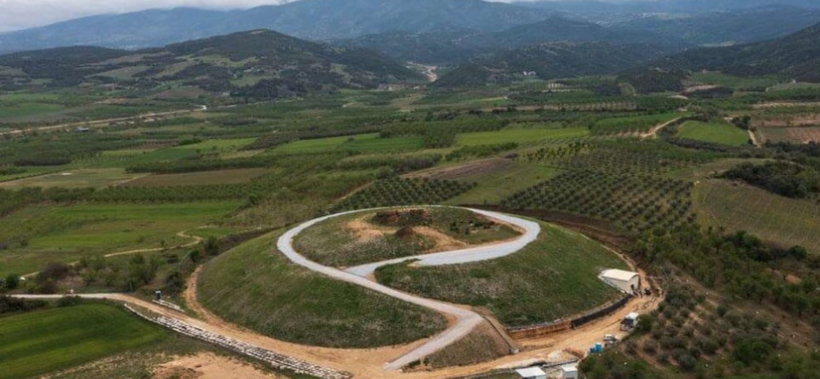 Λήψη του τύμβου της Αμφίπολης με τα στοιχεία που ανακαλύφθηκαν στη νοτιοδυτική του πλευρά. Φωτογραφία: Ελληνικό Υπουργείο Πολιτισμού