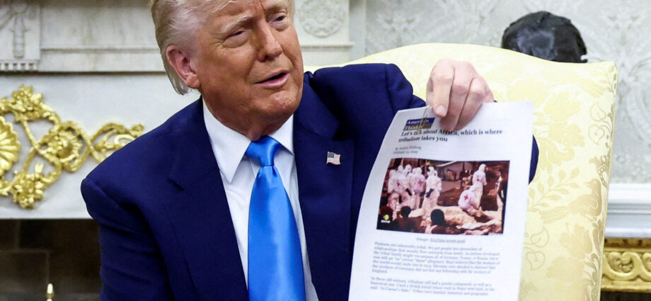 «Αυτοί είναι όλοι λευκοί αγρότες που θάβονται», είπε ο Τραμπ, κρατώντας ψηλά ένα αντίγραφο ενός άρθρου συνοδευόμενου από μια φωτογραφία κατά τη διάρκεια της αμφιλεγόμενης συνάντησης στο Οβάλ Γραφείο με τον Νοτιοαφρικανό πρόεδρο Σίριλ Ραμαφόζα.