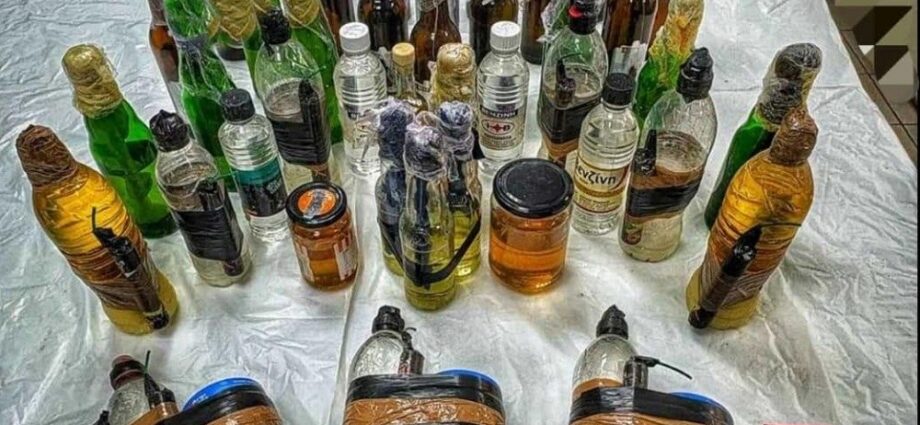 Συνολικά κατασχέθηκαν 49 ακέραιες αυτοσχέδιες εμπρηστικές – εκρηκτικές κατασκευές, δύο άδεια μπιτόνια με έντονη οσμή εύφλεκτου υλικού, ένα μπιτόνι με εύφλεκτο υγρό, και άλλα σύνεργα όπως μάσκες, γάντια, σφουγγάρια, μπουκάλια γυάλινα και πλαστικά,… Πηγή