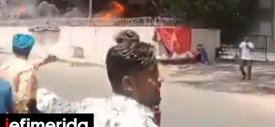 Πίσω του υψώνονται φλόγες και πυκνοί μαύροι καπνοί. Κάτοικοι έτρεχαν πανικόβλητοι φωνάζοντας, ενώ κάποιοι καλούσαν τις υπηρεσίες έκτακτης ανάγκης όταν τον είδαν….